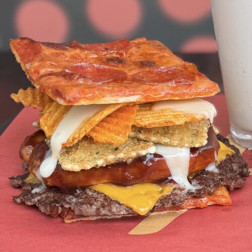 double burger with cheddar, pepper jack, bacon, onion straws, and topped with bbq sauce, potato bun
